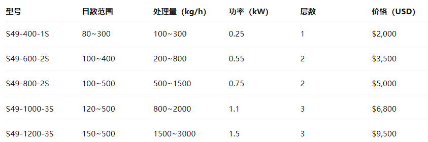 Description: S49 is a commonly used vibrating screen series. The number after the model represents the diameter of the screen machine, and S is the number of layers. The specific parameters can be customized according to needs.